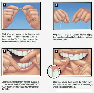 With either method of flossing, never "snap" the floss because this can cut your gums. Make sure that you gently scrape the side of each tooth with the floss.